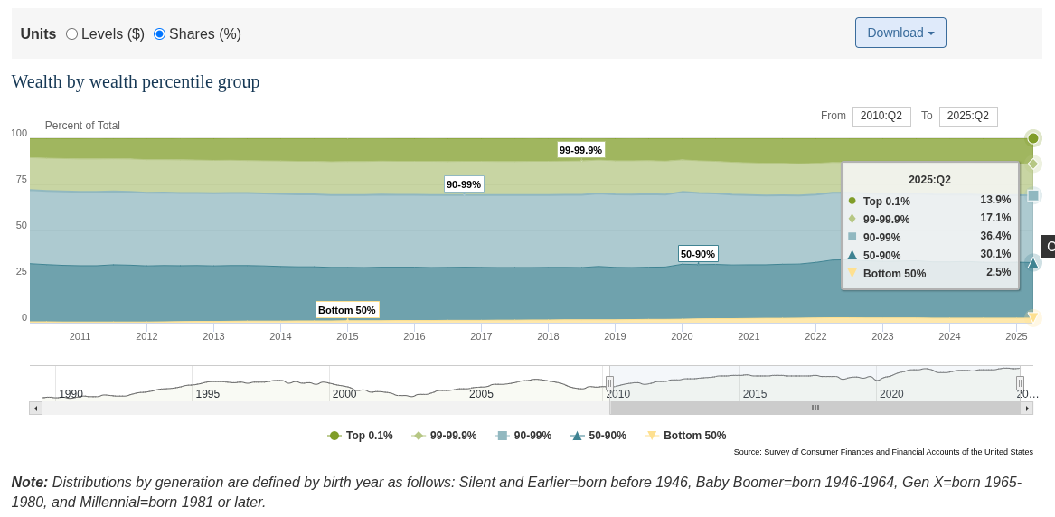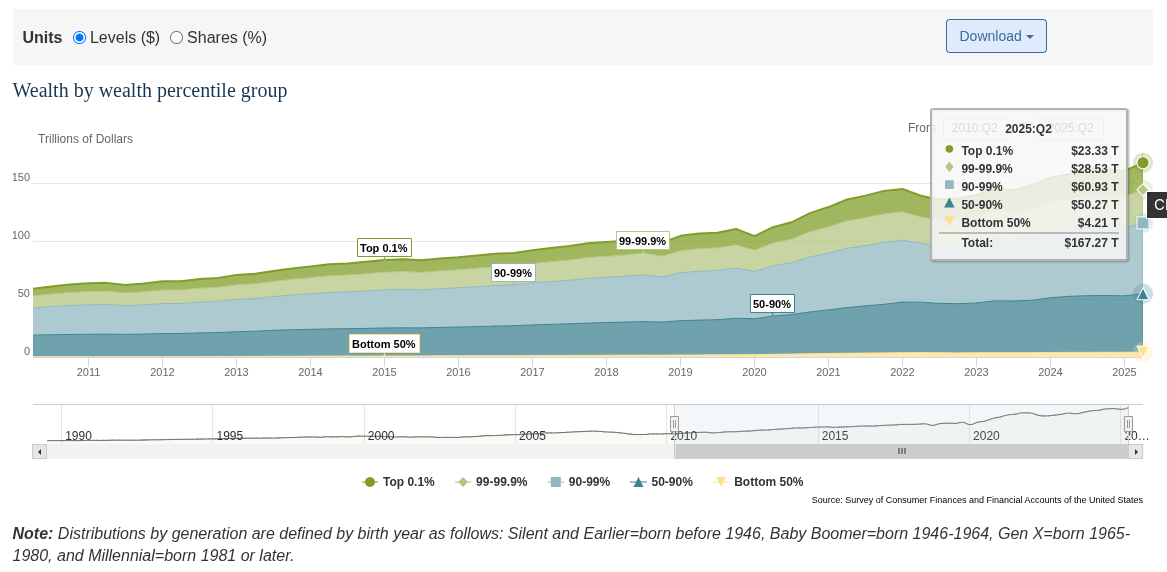 I think we can draw an inference in how the elites in America expect the rest of the world to behave by the following graphics, charts from the Board of Governors of the Federal Reserve Bank. Both charts show the evolution of the distribution of wealth over time in the United States by percentile ranking. The first in real dollar terms and the second, by percentage. The charts cover the time from 2010 to the present year.