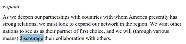 On page 17, we see the stick. We see that America has a variety of tools available to “discourage” other countries from seeking partnership with “the adversary”, Russia and China to name two.